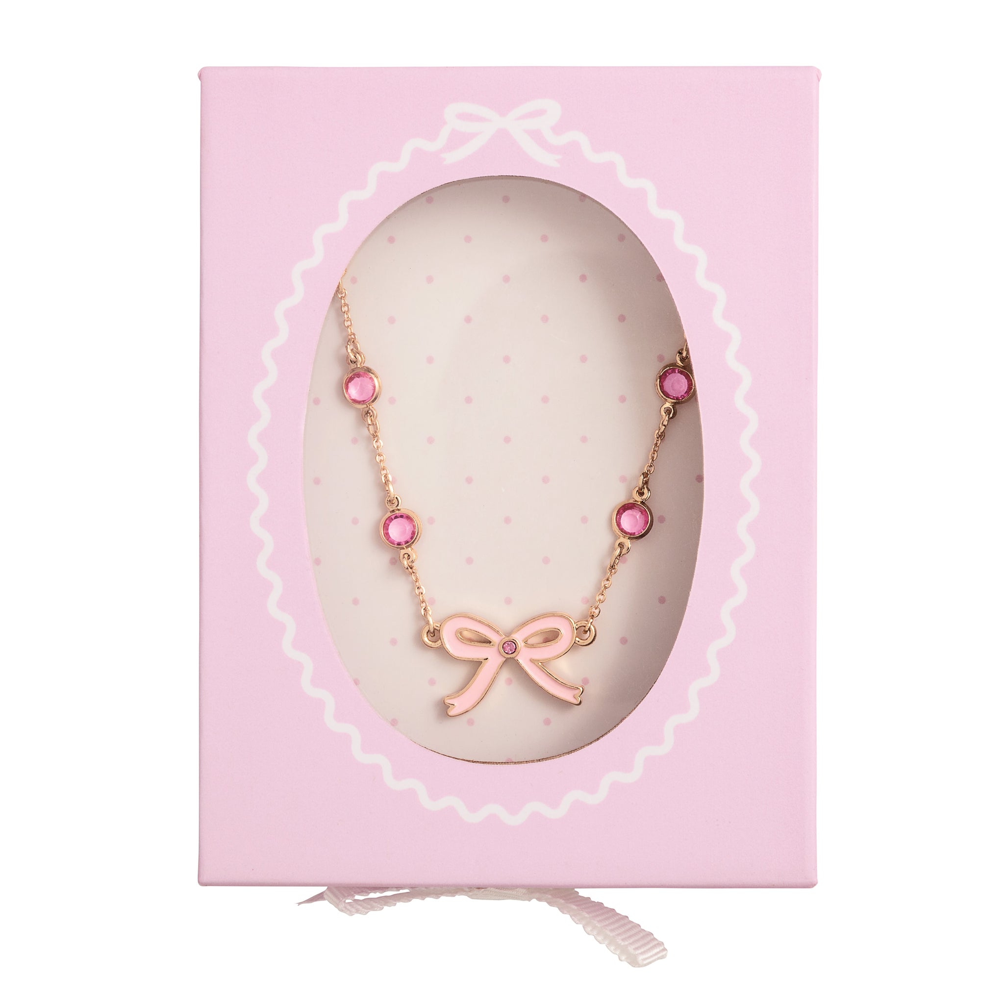 14" gold chain necklace features metal bow enamel charm with rhinestone detail. Ages 6M+.