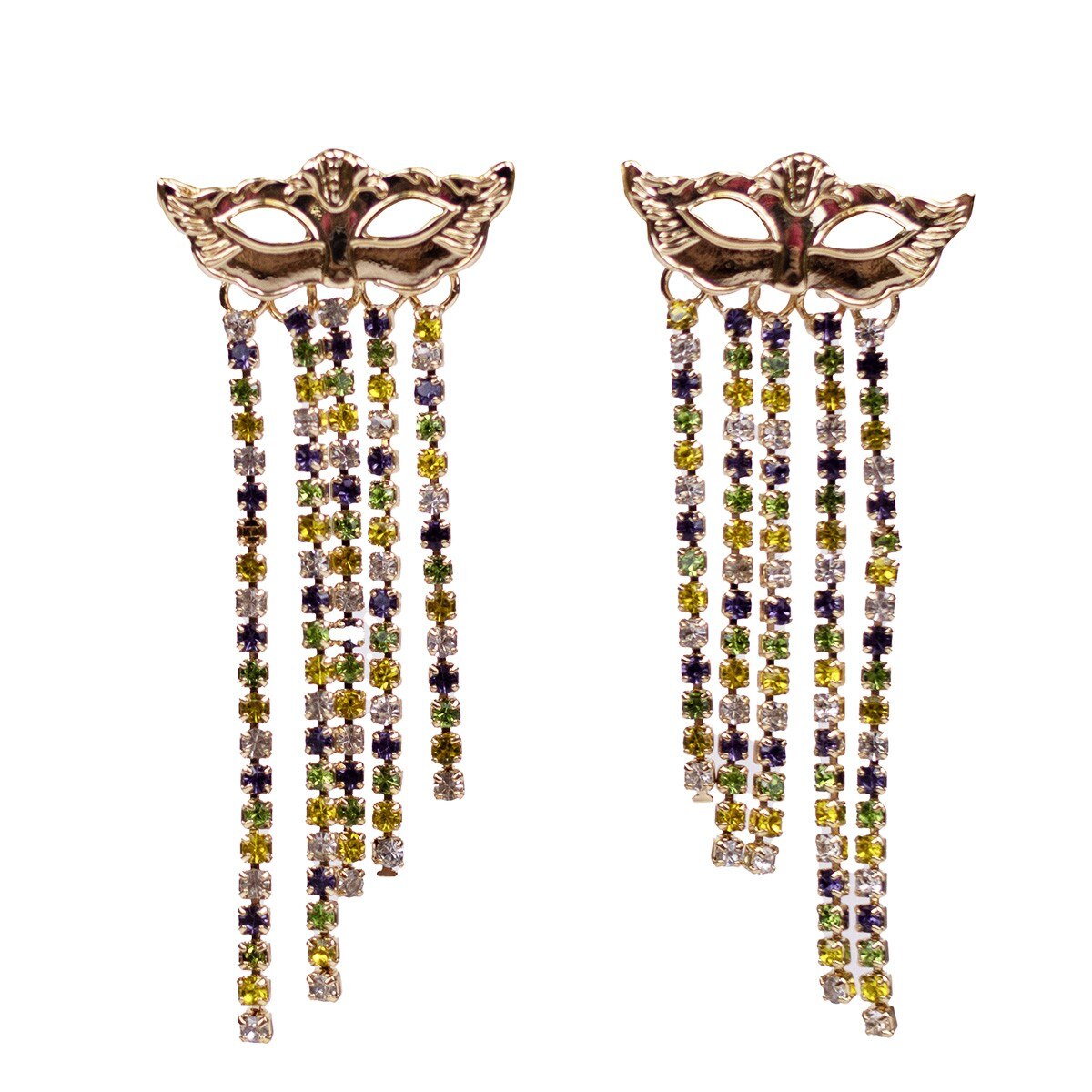 These stunning Krewe Ball Mask Earrings in Purple/Green/Gold are the perfect accessory for any Mardi Gras celebration. With a length of 2 inches, they are sure to make a statement and add a touch of festivity to any outfit.